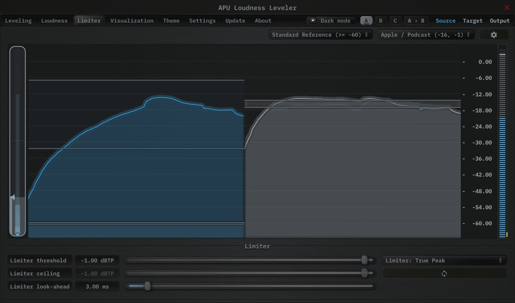 The limiter tab contains parameters relating to the built-in limiter. The limiter scans the limiter lookahead region of blocks for peak or true peak loudness values over the limiter ceiling. When these peaks are encountered, the current gain reduction trajectory is adjusted to accomodate the peak.