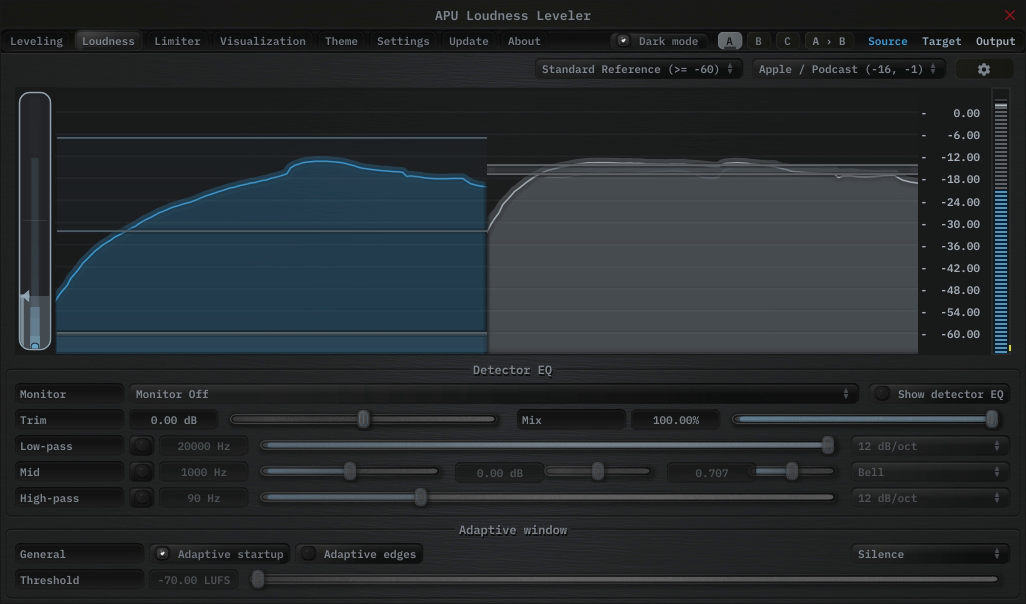 The loudness tab contains parameters relating to loudness measurements and detector behavior.